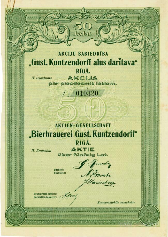28.11.1908. Krievijas valdība apstiprināja akciju sabiedrības «Gust. Kuncendorf alus darītava, Rīgā" statūtus.