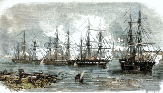 On 17 May 1854 Amphion (screw frigate, 34 guns, Captain Astley Cooper Key) and Conflict (screw sloop, 8 guns, Captain Arthur Cumming), entered Libau in the Baltic without firing a shot, and captured all the shipping in the port.