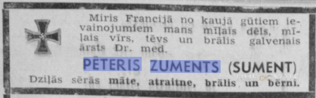 Pēteris Zuments bija galvenais ārsts, Dr.med. Miris Francijā no kaujā gūtiem ievainojumiem.