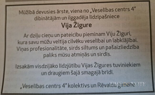 Mūžībā devusies ārste, viena no “Veselības centrs 4” dibinātājām un ilggadēja līdzīpašniece Vija Žīgure.