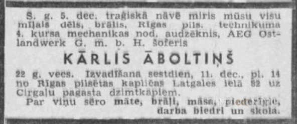 Rīgas tehnikuma 4.kursa mehānikas nodaļas audzēknis, AEG šoferis. Miris traģiskā nāvē. Apbedīts Cirgaļu pagastā.