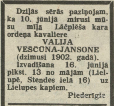 Valija Valērija Veščunas dzimusi 1902. gada 4. oktobrī Bulduros.