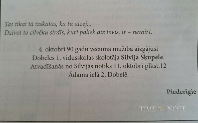 Silviju Šķupeli par savu pirmo skolotāju sauc vairāku paaudžu dobelnieki, atceroties ne vien skolotājas mīļumu, bet arī stingrību un prasīgumu. Šā gada 4. oktobrī, tieši Skolotāju dienas priekšvakarā, Silvija Šķupele ir devusies mūžībā.