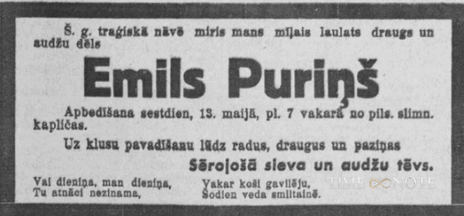 Pēc diviem mēnešiem atrasts bez vests pazudis vīrietis. Vakarrīt Ziemas un Tirdzniecības ostas stūrī zvejnieki ieraudzīja peldam ar straumi uz jūru kādu slīkoni. To izvilka krastā. Siīkušais bija pusmūža gados, tērpies zilās dungriņa drēbēs. Viņa kabatās nebija nekādu dokumentu. 11. martā bez vēsts pazuda Liepājas dzelzceļa darbnīcu virpotājs, 37 g. v. Emils Pūriņš, dzīvojošs T. Breikša ielā Nr. 28. Viņš bijis viesībās kāda paziņas dzīvoklī Kapsētas ielā. Pēc pusnakts atstājis dzīvokli, atstādams kažoku un solīdamies drīz atnākt atpakaļ. Aizgājis un pazudis. Sieva par vīra pazušanu ziņoja policijai, bet pazudušo atrast neizdevās. Tā kā bija aizdomas, vai atrastais slīkonis nav pazudušais Pūriņš, ziņoja viņa sievai un tā slīkušo atpazina par savu pazudušo vīru. Līķi ievietoja pilsētas slimnīcas morgā. Vakar sekcijā noskaidroja, ka nāve iestājusies noslīkstot. Nav noskaidrots, kādā kārtā P. ostā iekļuvis". (Kurzemes vārds, 12.05.1939)