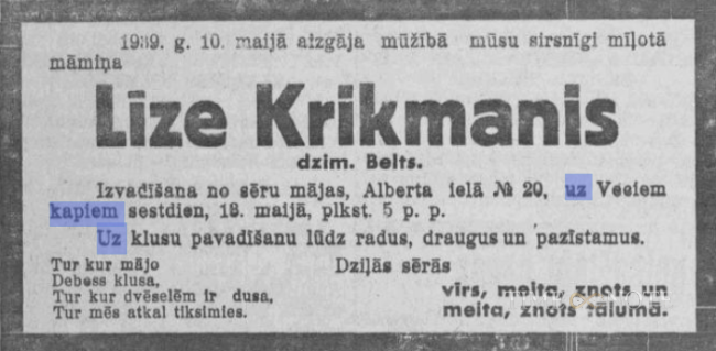 Izvadīta no sēru mājas Alberta ielā 20 uz Vecajiem kapiem.