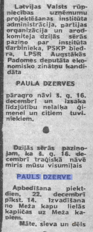 Negribu aprakstīt drausmīgo skatu, kad divas automašīnas vieglā un smagā triecās ar motoriem viena pret otru tajā šosejas līkumā (tagad tas ir iztaisnots) pie Ropažu dzelzceļa pārbrauktuves. Šķita, ka pelēkā «Pobeda» tiks saplacināta, pārvērtīsies vienā «bleķa pankūkā». Spēcīgais trieciens iedzina motoru pasažieru salonā, šī smagā, jau lūžņos pārvērstā metāla masa salauza krūtis abiem priekšā sēdošajiem braucējiem, Paulu Dzērvi caurdūra arī stūres balsts. Likās neviens tur nav palicis pie dzīvības; taču kā vēlāk uzzinājām, kādu studentu, kurš sēdējis aizmugurē, ārsti tomēr salāpījuši un izglābuši .Viņš, ja šobrīd vēl būtu mūsu vidu, droši vien varētu daudz ko vairāk pastāstīt. . .