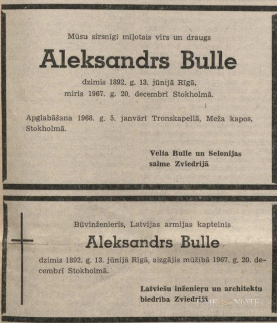 1962.gada 22.augusta "Laiks" raksta: "Nesen no Stokholmas uz Rīgu devās vācu okupācijas laika pašpārvaldes tirdzniecības un rūpniecības ģenerāldirekcijas vadītājs inž. Aleksandrs Bulle ar dzīvesbiedri. Ar latviešu juristu palīdzību aizbraucējs pirms tam sastādījis testamentu un uz atvadām, apciemojot Stokholmas latviešu paziņas, mēdzis skaitīt Puškina dzejoli par skaistumu mirt dzimtenē.
