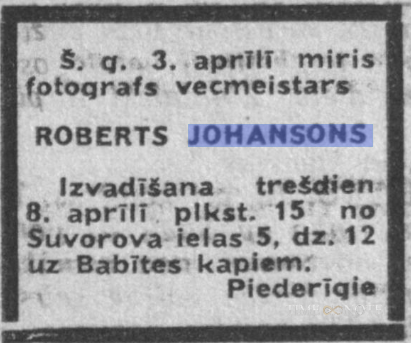 Latviešu fotogrāfijas aizsācējs. Roberts Johansons dzimis Aizkraukles pagasta „Tomiņu" mājās 1877. gada 8. decembrī.