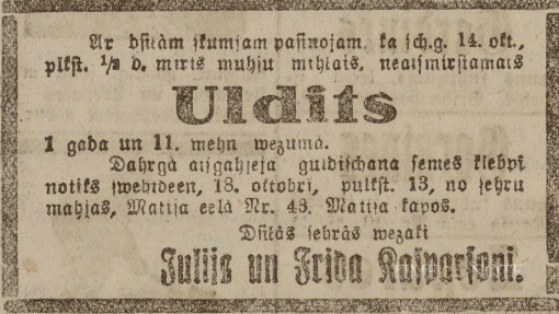 Vecāki Jūlijs un Frīda Kasparsoni. Izvadīts no sēru mājas Matīsa ielā 43.