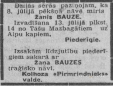 Miris traģiskā nāvē. Izvadīts no Tāšu "Mazbagātiem" uz Alpu kapiem. Iespējams, ka tie ir Antuļu kapi jeb kādi citi no tuvējiem kapiem.