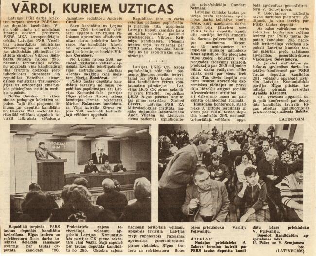 Republikā turpinās PSRS tautas deputātu kandidātu izvirzīšana. Rīgas traleru un refrižeratoru flotes darba kolektīva delegātu sanāksme izvirzīja par tautas deputāta kandidātu 708. Proletāriešu rajona teritoriālajā vēlēšanu apgabalā Latvijas Komunistiskās partijas CK pirmo sekretāru Jāni Vagri. Šajā sapulcē par tautas deputāta kandidātu no 295. Oktobra rajona nacionāli teritoriālā vēlēšanu apgabala izvirzīja Latvijas zivju rūpniecības ražošanas apvienības ģenerāldirektora pirmo vietnieku, Rīgas traleru un refrižeratoru flotes bāzes priekšnieku Vasiliju Poļivaniju.