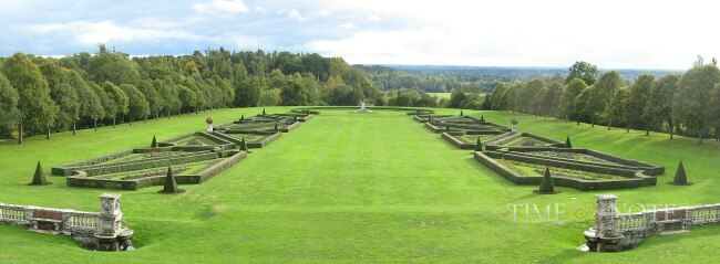 ParterreThe formal parterre to the south of the house is one of the largest in Europe at 4 acres (1.6 ha) and is best viewed from the 20-foot (6.1m) high terrace on the south side of the mansion. This part of the garden has received the most attention over the centuries. The first arranging of the large plateau to the south of the house took place c.1723 during George Hamilton, Earl of Orkney's ownership. Although he had previously commissioned plans for elaborate parterre schemes from Claude Desgots, the nephew of André Le Nôtre (both designers had previously worked at Versailles), Orkney eventually chose a much simpler plan involving an open expanse of lawn surrounded by raised gravel walks and double rows of elm trees. At the far end there was (and still is) a sunken feature in the turf where Orkney's horses were exercised in a form of open-air manège.